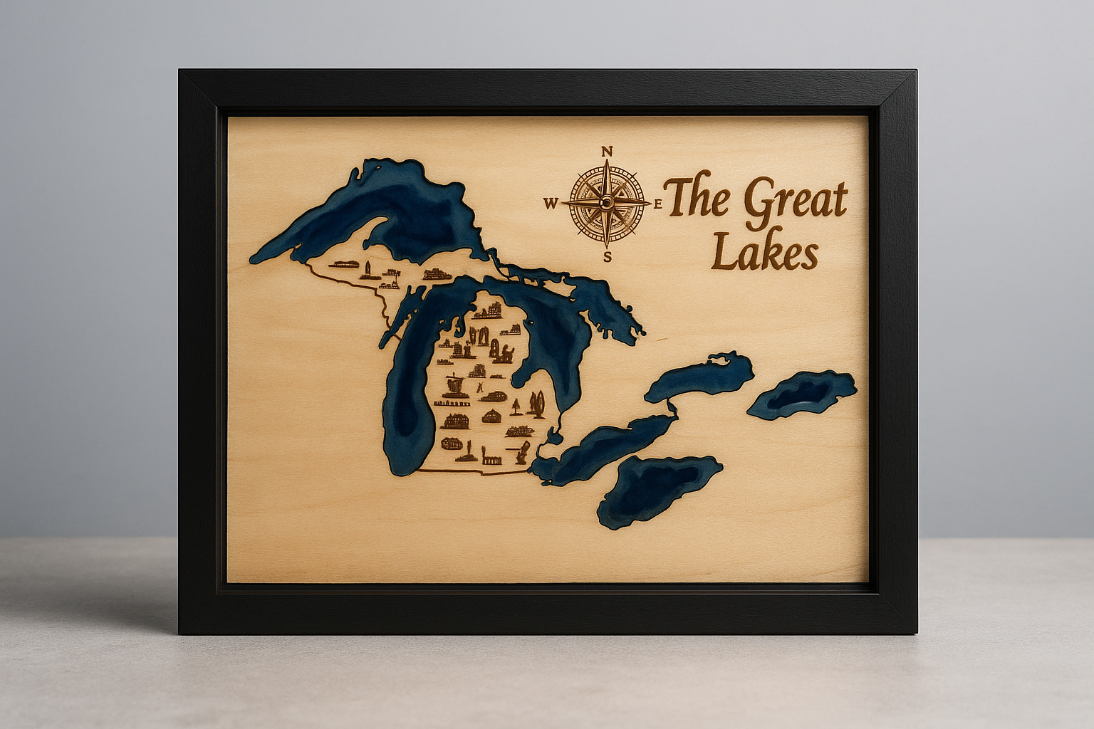 Laser Engraved Great Lakes Map with Resin Inlay – Framed 11x14 Wall Art