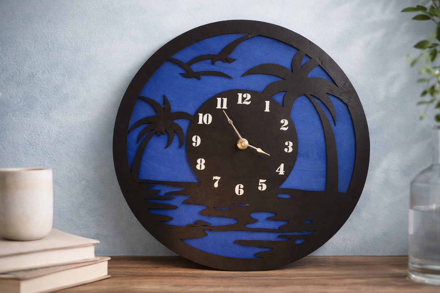Bring a bit of the beach into your home with this handmade laser-cut wall clock, featuring a tranquil coastal scene of palm trees, birds in flight, and rippling ocean waves. The bold black silhouette stands out beautifully against a rich, deep blue backdrop—creating a peaceful tropical vibe that's perfect for any room.